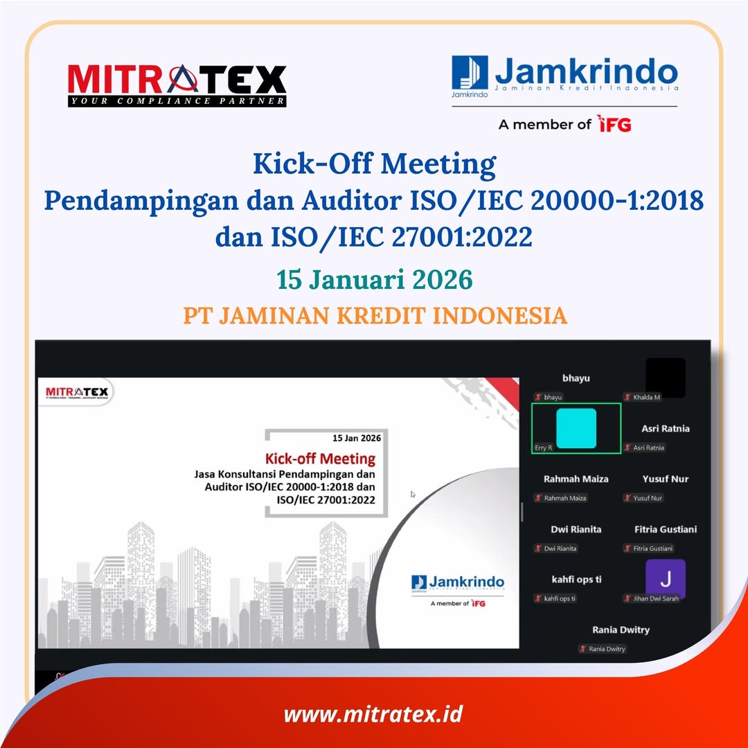 PT Mitratex Konsultan @mitratex.id memulai proyek Pendampingan dan Audit ISO/IEC 20000-1:2018 & ISO/IEC 27001:2022 di PT Jaminan Kredit Indonesia (Jamkrindo).