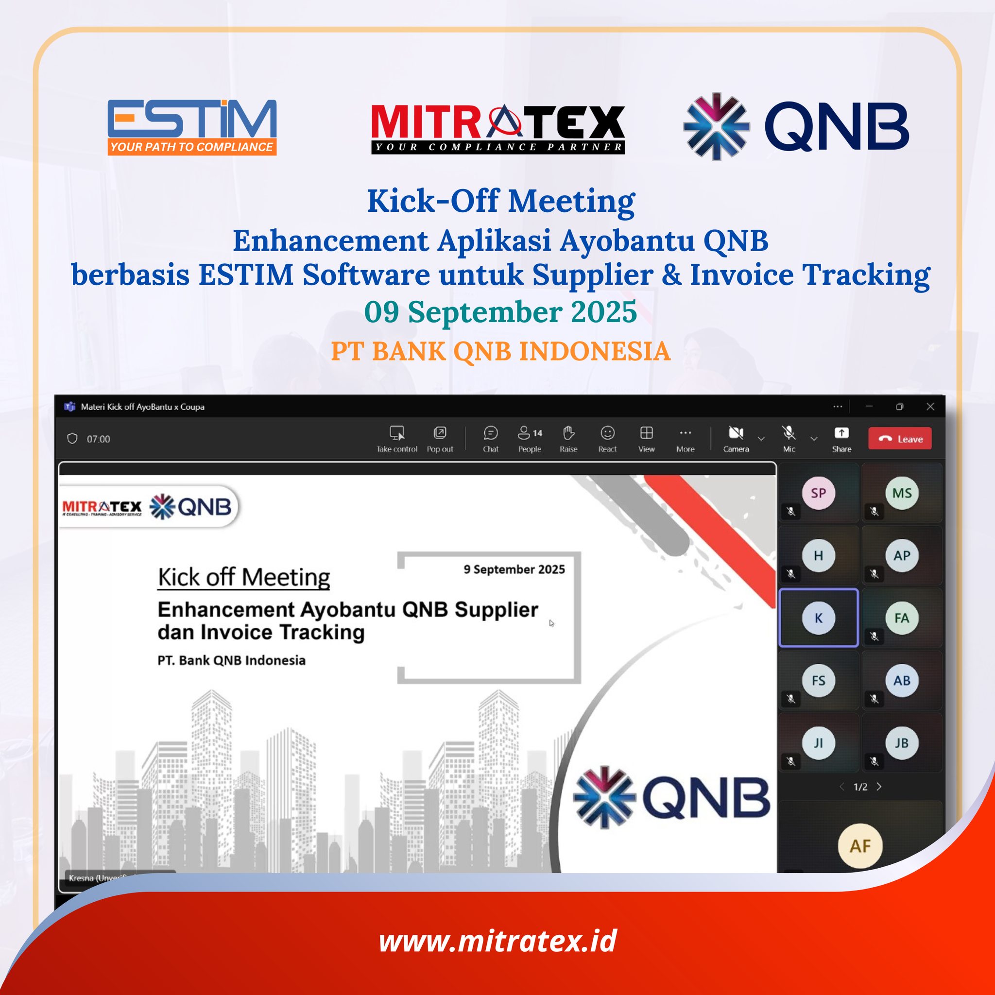 #MitratexConsultant #Mitratex #YourCompliancePartner #BankQNBIndonesia #ProjectKickOff #AyobantuQNB #ESTIMSoftware #SupplierTracking #InvoiceTracking #DigitalTransformation #BusinessProcessImprovement #Compliance #SolusiTI